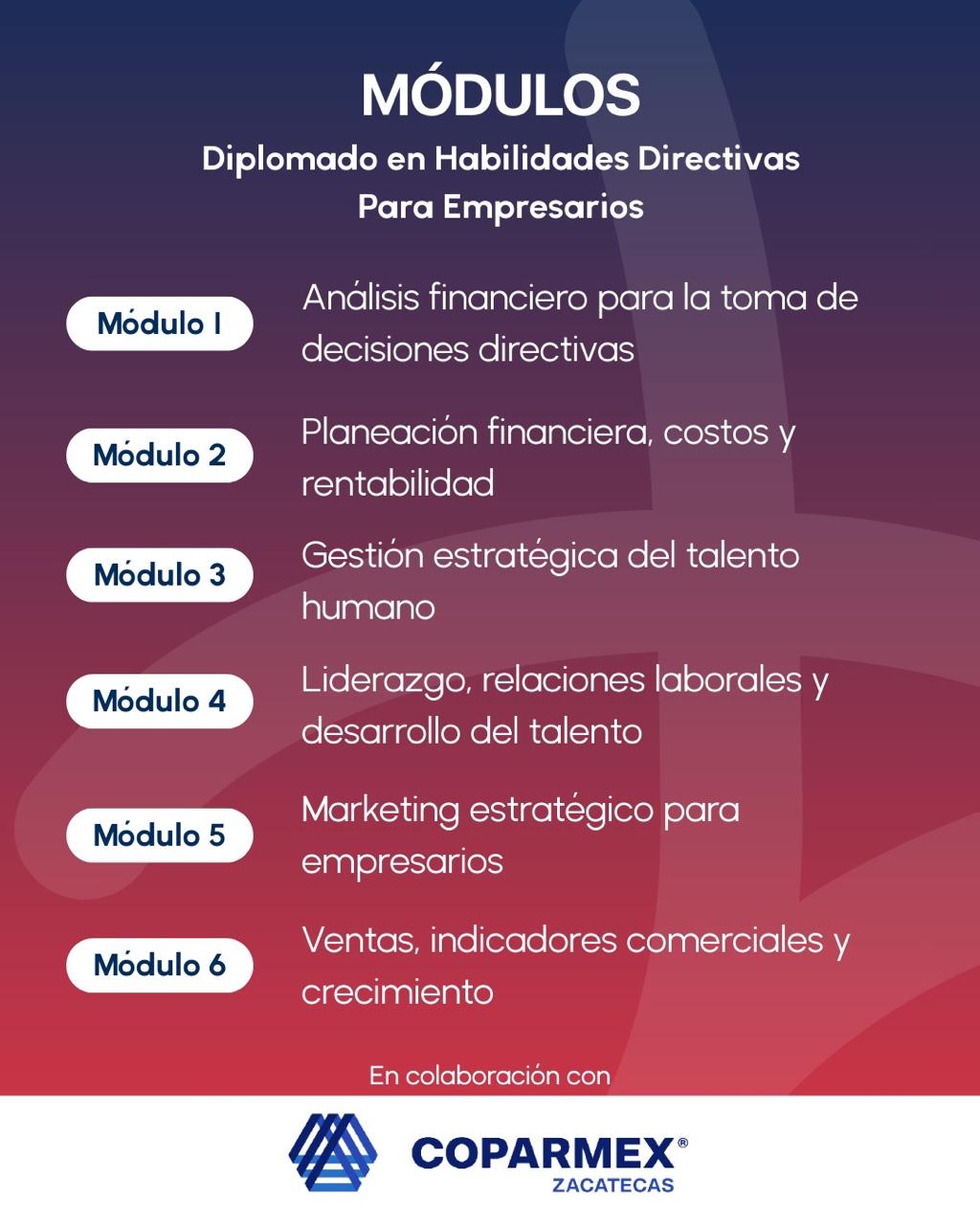Módulos: 6 ejes estratégicos (Finanzas, Liderazgo, Ventas, Visión Global y Estrategia).