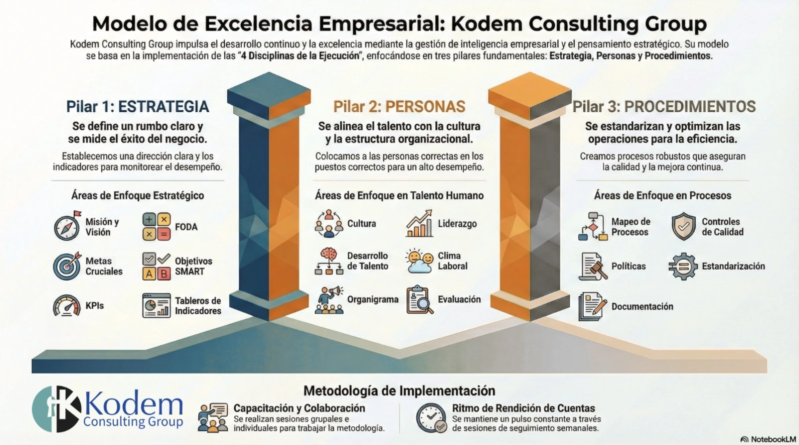 Tener una gran idea es solo el 10% del éxito; el resto es una ejecución impecable. En Kodem Consulting Group, no dejan los resultados al azar. Su Modelo de Excelencia se basa en las '4 Disciplinas de la Ejecución', un sistema probado para alinear la estrategia con el talento humano y los procesos operativos. Conoce los tres pilares que sostienen el crecimiento de los clientes Kodem: