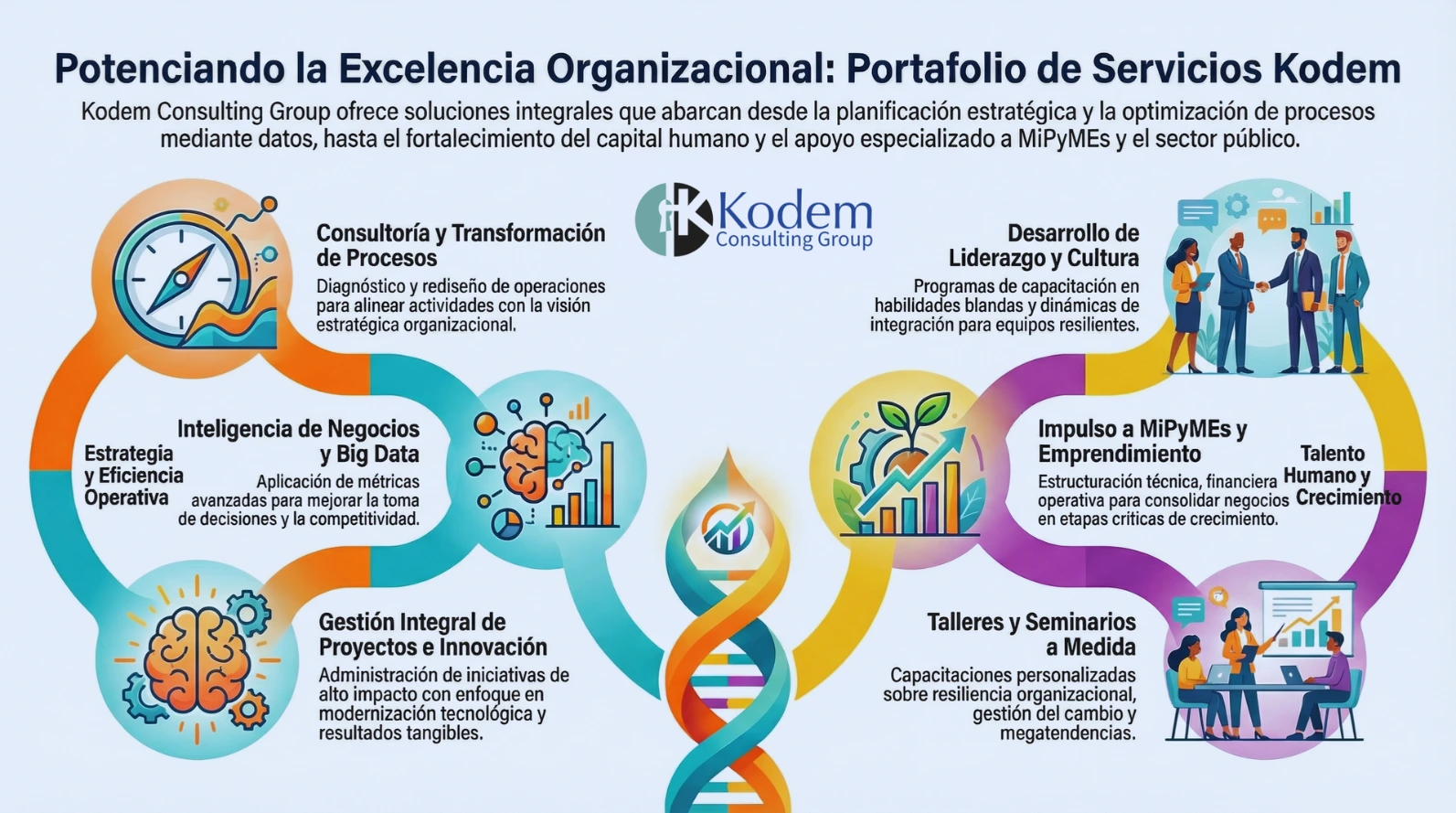 Kodem Consulting Group es una firma especializada en asesoría, acompañamiento estratégico y capacitación para MiPyMEs y organismos públicos, enfocada en fortalecer su estructura, gestión y desempeño organizacional. Su valor añadido radica en combinar metodología técnica, visión sistémica y enfoque humano para transformar la estrategia en acción concreta: diseñamos procesos, modelos de gestión, cumplimiento normativo y herramientas prácticas que no solo ordenan la operación, sino que generan claridad financiera, alineación de equipos y resultados medibles adaptados a la realidad de cada organización.